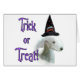 Serão truques ou ameaças neste Halloween? Nosso design de Natal tem sua raça favorita de cachorro, o Bedlington Terrier, vestindo um chapéu de bruxa. Adicione um pouco de 'Hocus Pocus' a All Hallows este ano!