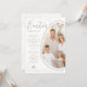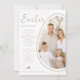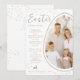 Celebrate Easter with a modern, playful twist with this customizable card designed by Destei. Your photo is placed inside an egg shape, intentionally cropped at the edge for a fun, asymmetrical effect that makes the design feel dynamic. White and beige borders frame the egg, while “Easter Greetings” appears at the top, leaving plenty of space underneath for a personal message. A cute lying-down bunny silhouette adds another festive touch and a personalizable area lets you include a name and year. Beige dot accents decorate the edges and continue onto the back, giving the card a subtle, stylish pattern that feels both elegant and cheerful.