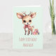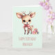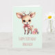 Cartão de aniversário com ilustração de um adorável veado bebê. Olhos grandes orelhas com cabeça grande e pequenos galhos castanhos. Vestindo um grande arco vermelho. Ao lado de uma pilha de presentes.