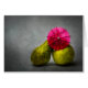 Vista aproximada de duas peras atrás do guarda-chuva de cocktail vermelho. A água cai ao redor deles. O céu é cinza e o tempo é tempestuoso
