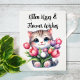 Envie um pacote de pura alegria com este cartão de saudação de adorável gatinho! Com um gatinho irresistivelmente fofo de olhos grandes segurando um vibrante buquê de tulipas rosa e roxas, este design caprichoso é perfeito para qualquer ocasião que exija doçura e sorrisos. A frente diz "Beijos de Gatinho & Desejos de Flores" em elegante letra cursiva divertida.