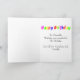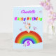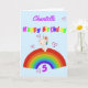 Este é um cartão de aniversário de 5 unicórnio. Este cartão de aniversário colorido apresenta um unicórnio branco sentado num arco-íris cercado de corações e texto colorido. Um design bonitinho para uma jovem que terá cinco anos de idade com amor por unicórnios. Este cartão pode ser personalizado adicionando o nome da criança à frente para torná-lo especial para uma garotinha. A mensagem dentro é "Para Chantelle, desejando-lhe um maravilhoso aniversário de 5, muito amor vovó e vovô" pode ser alterada conforme necessário.