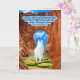 Belo Cartão Escritório Eskie de uma cena colorida e detalhada onde um lindo Cachorro Eskimo Branco Americano caminha em uma trilha verde iridescente de pedra, com paredes de pedra vermelha em direção a uma rocha vermelha e arada. A porta se abre em um belo céu azul nublado. Esta cena acompanha o verso Bíblia Proverbs 16:9, "O coração de um homem deviseth seu caminho: mas o LORD direcionou seus passos." Este cartão faz um presente maravilhoso ou pode ser usado para nos lembrar da Palavra de Deus.
