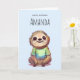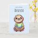 Cartão de aniversário com uma ilustração adorável com uma preguiça feliz vestindo uma camiseta verde. Para aqueles que adoram ver animais vestidos de roupa.