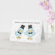 Um cartão de parabéns de casamento para um casamento de gay. Design apresenta dois pássaros azuis vestindo chapéus superiores e gravatas arcos. Pálidas cinzas de campainhas.
