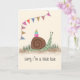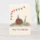 This is a cute belated birthday card showing a snail crawling along the ground with two presents and cupcake with a candle on its body. There is a colorful flag banner with the text ‘sorry I’m a little late.’