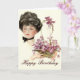 Ilustração vítrea de uma beleza cabeleira escura com cabelo arrepiado, uma fita escura ao redor do pescoço e segurando uma cesta de flores roxas. Abaixo, no roteiro, "Parabéns". Personalize o dentro como desejar.