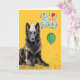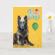 Vestindo um chapéu de aniversário bolinhas, este doce Belga Tervuren Shepherd envia desejos de feliz aniversário para o amante do cachorro com uma alegre gama de cores e um balão flutuante.