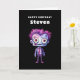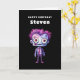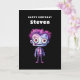 Cartão de aniversário com uma ilustração fofa. Monstro de Frankenstein com cabelo rosa e roxo e um terno e gravata.