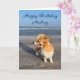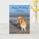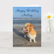 Belo cartão de aniversário de corgi personalizado com um fofo Pembroke Welsh Corgi em frente ao oceano. Esse cachorro bonitinho com rabo ri na frente de uma praia bonito e seu texto azul.