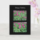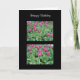 Um belo cartão com fotos de lindas tulipas roxas/fushia entre sua bonito folhagem verde.