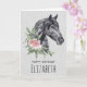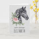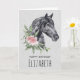 Cartão de aniversário com uma bela ilustração de uma cabeça de cavalo preto com um enfeite floral sofisticado no pescoço. Pintura animal elegante e sofisticada. Fundo manchado de cinza.
