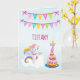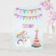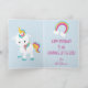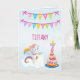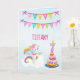 Feito para uma menina de 7 anos, este cartão de aniversário de unicórnio é incrível. Exibido em um fundo azul claro, há uma faixa rosa, azul e amarela anunciando "Feliz Aniversário". O nome dela é personalizado no centro do cartão de aniversário usando fonte rosa. Um unicórnio branco com asas voando em uma nuvem está na parte inferior esquerda do cartão. O número 7 está no topo com uma vela de aniversário. Faça seu pedido hoje!