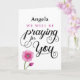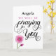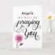 Encorajar alguém a recuperar-se de uma doença ou lesão, informando-os que estão a rezar por eles pelo nome com esta design de tipografia frontal personalizada que inclui a mensagem "NOME PERSONALIZADO AQUI estaremos a rezar por ti." O design é acentuado pela bela flor rosa de água no canto inferior esquerdo da carta. O dentro pode ser personalizado com sua própria mensagem.