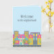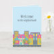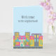 "Bem-vindo à vizinhança!". A design apresenta um bairro urbano fofo sobre um fundo azul claro. Perfeito para condomínios e apartamentos.