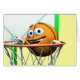 Um presente de excelente para um fã de basquete. Uma engraçada bola de basquete laranja cai através de um aro de basquete com um grande sorriso.
