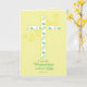 Uma placa de Felz pascoa com "Eu sou a ressurreição e a vida" do livro do verso da Bíblia John 11:25. O cartão é decorado com uma cruz cheia de pequenas flores lírios e folhas complementadas com flores amarelas suaves em fundo amarelo pastel. No dentro é a mesma sombra de amarelo e uma mensagem que você pode adicionar ou editar ao ajustado de suas necessidades.