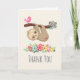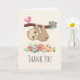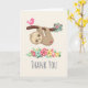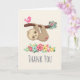 Um cartão de agradecimento com uma ilustração de um bicho-preguiça marrom fofo pendurado de cabeça para baixo. Esse pequeno sujeito engraçado está segurando um galho que tem um passarinho rosa de um lado e um buquê de rosas estilo doodle do outro. Abaixo deles, há um arranjo de flores coloridas desenhadas à mão. Esse bicho-preguiça adorável também tem bochechas rosadas e 3 corações fofos na bunda. Mensagem personalizada no interior.