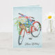 Bicicleta vermelha com buquê de flor em uma cesta de fundo de turquesa texturizado macio. Todo o texto pode ser alterado.