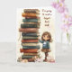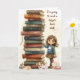 Girl stands next to a tall stack of books. She is surrounded by cozy little animals. The words say "I'm going to need a bigger bookshelf." The card is blank inside.