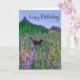 This birthday card features a beautiful mountainous landscape with a hillside of wildflowers and a black cat strolling leisurely. The card wishes the recipient a happy birthday.
