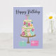This is a birthday card with a double layered birthday cake decorated with flowers, leaves and candles. There are two wrapped presents with ribbons and bows.