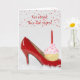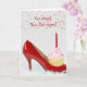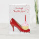 Red high heel shoe with a birthday cupcake and party confetti on white fur for a birthday.