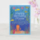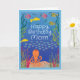 This is a pun birthday card for mom with an underwater scene of colorful fish, plants, shells, a school of fish and an octopus with the inside text of "Seas the Day." The pun is using Seas and showing fish in place of the saying seize the day.
