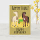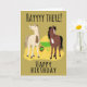 This is a funny birthday card with two illustrated horses, one cream and one brown. The text is a pun saying, ‘Hayyyyy there! Happy Birthday’ with the horses standing in hay and a green wheelbarrow, filled with hay next to them.