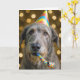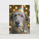 An Irish Wolfhound dog wearing a colorful party hat and noisemaker against a gold bokeh background.