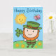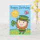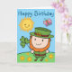 Deseje a alguém um Feliz Aniversário com este lindo duende irlandês de desenho animado com uma barba de gengibre um chapéu verde e roupa e segurando um shamrock de sorte. No céu de verão há um sol amarelo feliz e uma borboleta fluindo sobre isso.