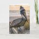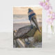 A pelican perched on a beach fence wears a winter hat and vest, set against a serene backdrop of gentle ocean waves and a soft sky