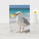 A seagull holds a potato chip in its beak while standing on a sandy beach, with the clear blue ocean creating a serene backdrop.