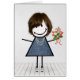 Menina de pau branca com tênis para vestir cabelos e buquês de flores, colar de pérolas e vestido de jean azul no chão de madeira