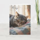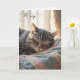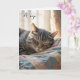 Um gato de mesa cochila pacificamente numa colcha confortável e padronizada com iluminação suave à luz do dia para o aniversário. Todo o texto pode ser alterado.