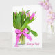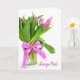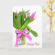 Tulipas cor-de-rosa brilhantes no vaso com arco de bolinhas para Mãe.