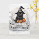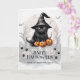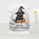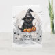 Feliz cartão de Dia das Bruxas com um gato preto giro vestindo um chapéu, abóboras assustadoras, morcegos voadores e o Lua do cheio. Personalize facilmente este belo cartão de Halloween com seu nome familiar, foto e texto.