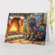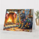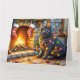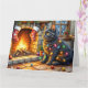 Cartão Black Cat Sitting Fireplace with Christmas Lights