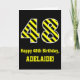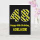 A frente desta design de cartão de saudação ousada e divertida com tema de aniversário apresenta um grande número "48" com um padrão de listras amarelas e pretas, juntamente com a mensagem "Feliz 48º aniversário", e um nome personalizado. O fundo da frente é preto colorido. O dentro apresenta uma mensagem de saudação de aniversário personalizável, ou talvez possa ser apagado e deixado o vazio se uma mensagem for escrita manualmente. Um cartão de aniversário como este pode ser uma maneira divertida de enviar desejos de aniversário a alguém que comemora seus quarenta e oito anos. [~Z0000382]