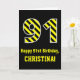 A frente deste design de cartão de cumprimentos temático de aniversário ousado e atencioso apresenta um grande número "91", com um padrão de listras preto e amarelo. Também apresenta a mensagem "Feliz aniversário de 91ruas", e um nome personalizado. O fundo da frente é preto colorido. O dentro apresenta uma mensagem de saudação de aniversário personalizada, ou talvez possa ser apagado e deixado vazio se uma mensagem for escrita manualmente. Um cartão de aniversário personalizável como este pode ser uma maneira divertida de enviar uma mensagem em comemoração do 90° aniversário de alguém. [~Z0000382]