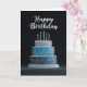 A striking birthday card featuring a shimmering blue and silver tiered cake set against a dramatic black background. Delicate details and glowing candles add a touch of elegance, making this design perfect for a sophisticated and memorable celebration. Blank inside for your own personal message.