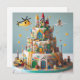 DIVERTIDO POR CRIANÇAS, BLOQUEIOS COLORIDOS BRINQUEDOS BRINQUEDANDO O BOLO DE CAMADA DE ANIVERSÁRIO DE CRIANÇA NA FRENTE DA PLACA. CÓPIA COMPLETAMENTE EDITÁVEL NA PARTE TRASEIRA.