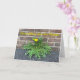 Este cartão de saudação apresenta uma foto de um dandelion crescendo contra uma parede de tijolos com a mensagem "Bloom Where You Are Plantar" em letras amarelas na frente. A dentro desta placa está vazio e pronta para ser personalizada com a sua própria saudação.