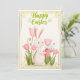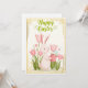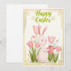 A cheerful white bunny waters pink tulips with a pastel watering can, surrounded by spring blooms and golden accents. This card celebrates Easter with a touch of garden magic, perfect for sending joy and renewal.