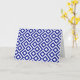 This bold blue and white geometric pattern is an original ornamental design. White meanders angle around dark blue diamonds containing white diamonds. Vibrant blue zigzags provide subtle separation between the winding paths.