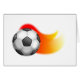 Ilustração colorida de uma bola de futebol voando pelo ar com uma trilha de calor ou chamas que são deixadas no seu acordar. Imagem disponível em vários presentes e produtos.
