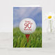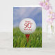Feche acima de uma bola de golfe branca em um T vermelho na grama com fundo do céu para o aniversário do 90.