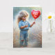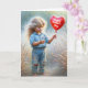Linda menina vestindo jeans azul rasgado e segurando um balão vermelho em um campo para o Dia das Mães.