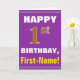 This simple birthday-themed greeting card design features a warm birthday wish like "HAPPY 1st BIRTHDAY, First-Name!" on the front, in bold text on a purple colored background. The birthday number has a faux/imitation gold-like coloring appearance. The name on the front can be customized. The inside features a customizable birthday message. A greeting card like this could be a fun way to deliver birthday wishes to somebody who is celebrating their first birthday. [~Z0000277]