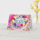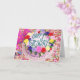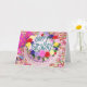 Uma festa à espera de acontecer! Um bolo de aniversário elaborado com rosas de açúcar em todas as cores que circulam no topo do bolo; chapéus de festas e barulheiras sentam-se ao lado do bolo numa mesa completamente coberta de confete. O dentro de mensagem pode ser excluído ou alterado para uma mensagem própria. O coração na parte traseira do cartão também pode ser apagado se você desejar.